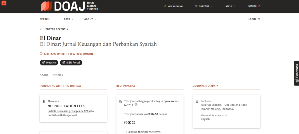 Salah satu jurnal yang dikelola FE UIN Malang, yaitu El Dinar: Jurnal Keuangan dan Perbankan Syariah, secara resmi dinyatakan berhasil menembus indeksasi internasional pada DOAJ (Directory of Open Access Journals), pertanggal 18 April 2026. Masuknya El Dinar ke dalam basis data DOAJ menjadi bukti bahwa kualitas pengelolaan artikel dan standar