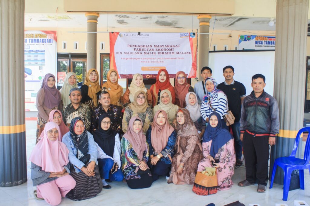 FE UIN Malang melalui Laboratorium Pengabdian Kepada Masyarakat kembali melaksanakan Pengabdian Kepada Masyarakat dengan tema Pengembangan Kompetensi untuk Memasuki Dunia Kerja di Era Digital bagi UMKM dilaksanakan pada Selasa, 22 Juli 2025 di Balai Desa Tambaksari, Kecamatan Purwosari, Pasuruan dengan peserta para pelaku usaha UMKM warga desa Tambaksari. Sambutan dari