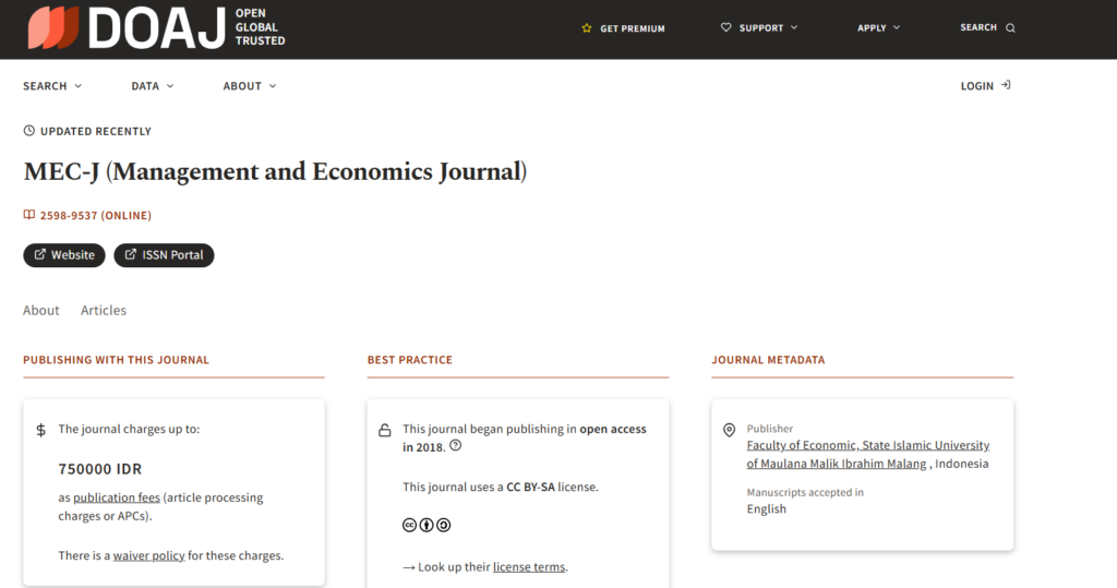 MEC-J merupakan jurnal yang berfokus pada pengembangan teori dan praktik di bidang Manajemen dan Ekonomi. Dengan masuknya ke dalam indeksasi DOAJ, artikel-artikel penelitian yang diterbitkan di MEC-J kini memiliki standar akses terbuka yang diakui secara global, menjamin transparansi publikasi, serta mempermudah para peneliti dunia untuk mengakses dan merujuk pada hasil riset dari civitas akademika UIN Malang.